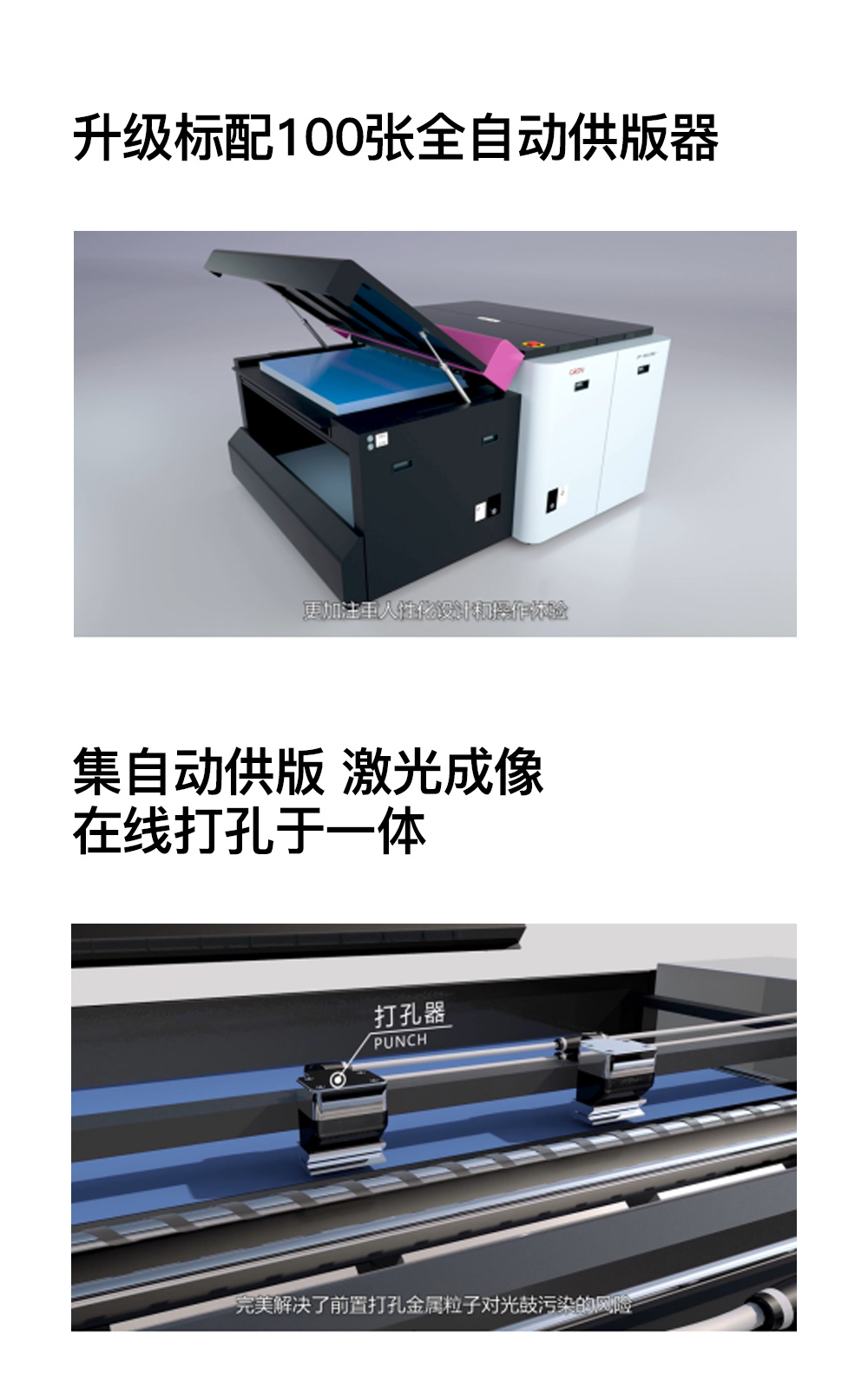 46Hn CTP集自动供版、激光成像、在线打孔于一体,集成高效。升级标配100张全自动供版器,减少放版次数,提高效率,节约人工成本。新增自动整理衬纸功能,内置在线打孔装置,可安装5组模具,满足多样化客户需求。46Hn CTP是涵盖商业印刷、报业印刷的全自动化制版设备,延续了科雷CTP高集成性、高度自动化,多精度高精度的优势,可升级至10160dpi ,完全满足中等幅面及以下的包装、纸盒、书刊、报刊、画册、单页等印刷。
